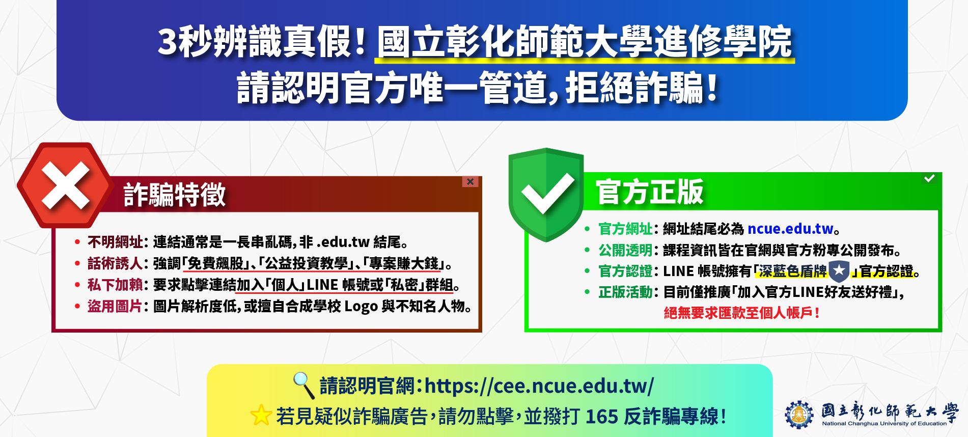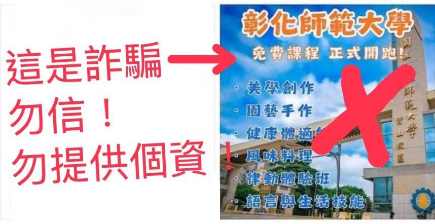 【嚴正聲明】國立彰化師範大學進修學院呼籲防範詐騙!官方課程僅在正規管道發布,切勿輕信不明「免費課程」廣告