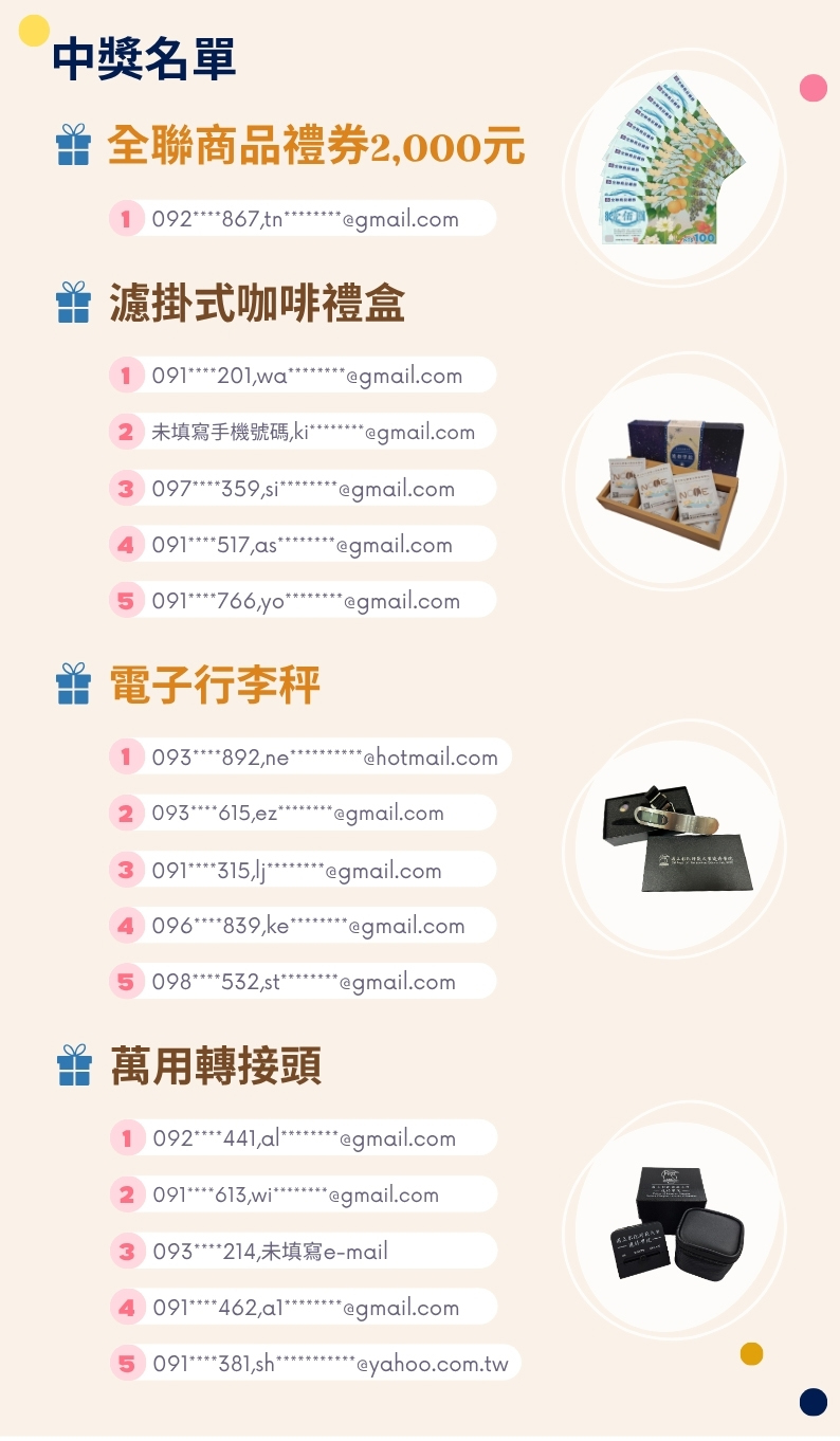 回覆中獎通知e-mail,將收件資訊(收件人姓名、含郵遞區號之地址、電話),寄至本院推廣信箱promotion@gm.ncue.edu.tw,逾期視同放棄領獎機會。